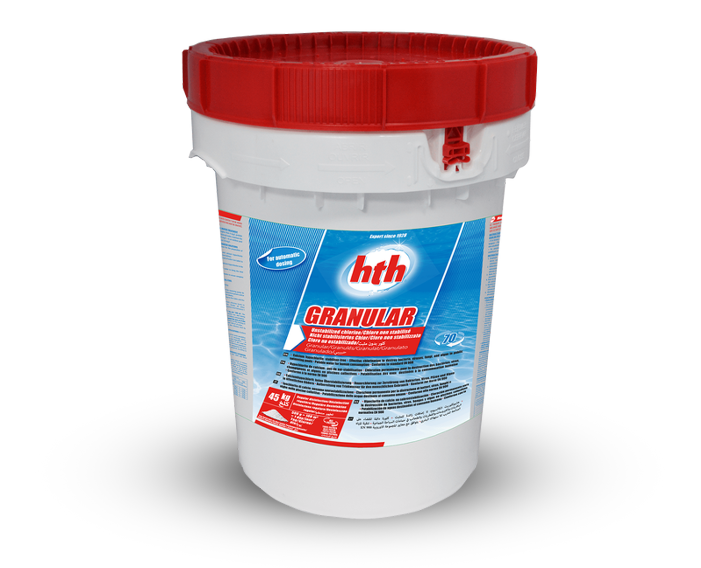 El Hipoclorito de Calcio (Ca(OCl)2•2H2O HTH ® contiene 68% de cloro disponible, es conveniente y fácil de manejar, requiere menos espacio de almacenaje y tiene una vida útil de almacén significativamente más larga que la de los esterilizadores líquidos. El producto está disponible en forma de materia granular fluyente.