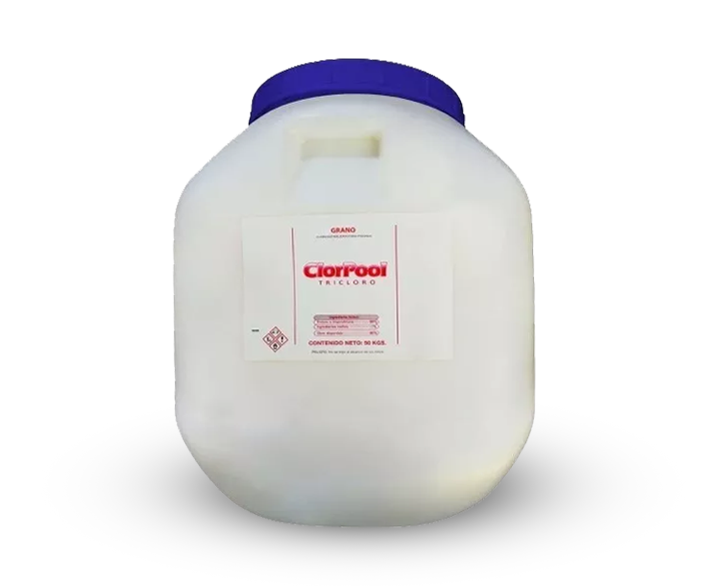 Cuñete de 50 kilos de cloro concentrado al 90% estabilizado que se usa como biocida, bactericida, fungicida y alguicida en el agua de las piscinas.